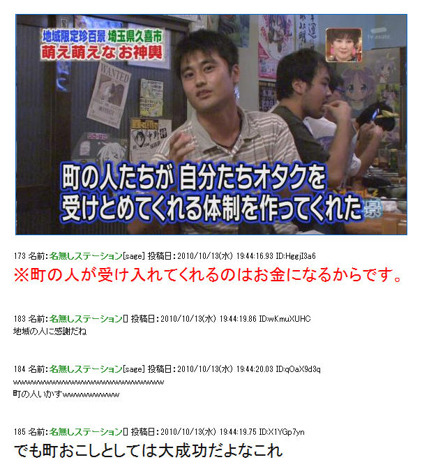 こういったシーンに関して「祭りなのに何『萌え』なんてキモイこと叫んでんだ」とか、「周辺住民はいい迷惑だろ」という声もあります。