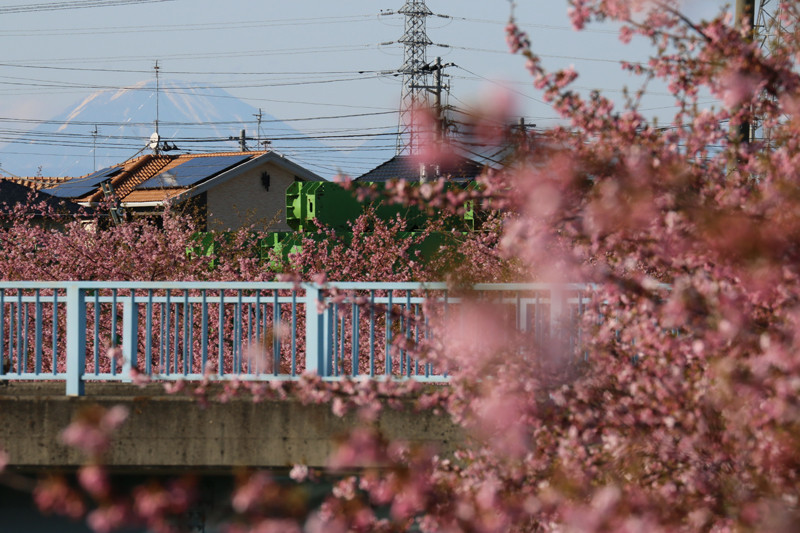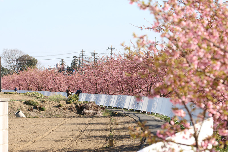 河津桜は、一般的な桜(ソメイヨシノ等)より咲く期間(短時間で一気に咲くのではなく、分散して咲くため)が長く、花びらの色も濃いめのピンク色で鮮やかさが際立っている桜です。
