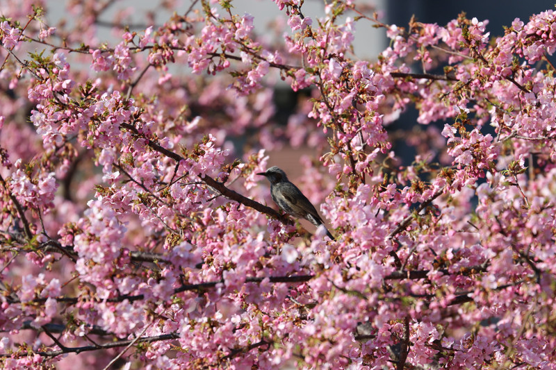 そんな感じで撮っていると、丁度近くの桜に鳥が蜜を吸いに枝に止まりました。