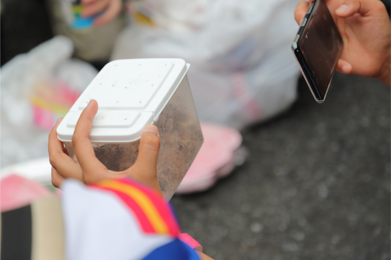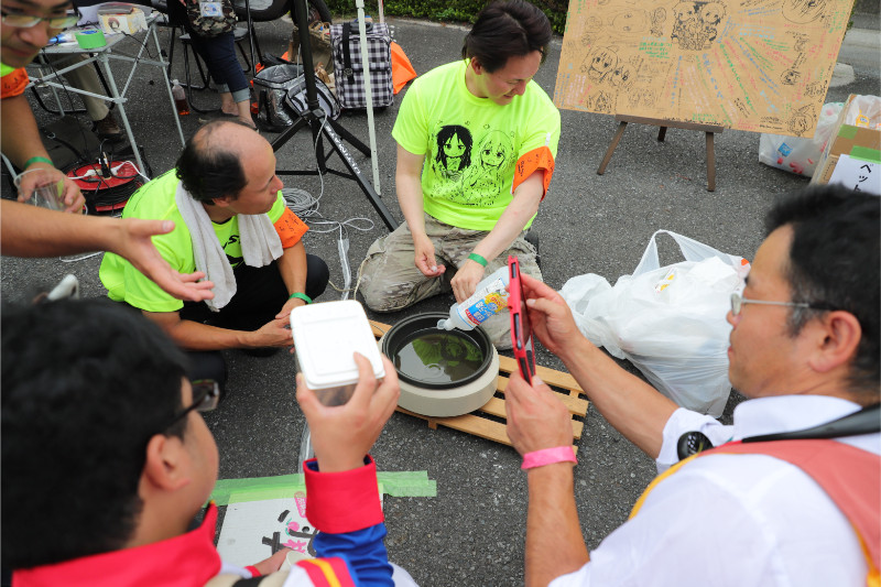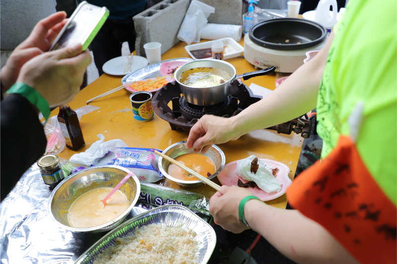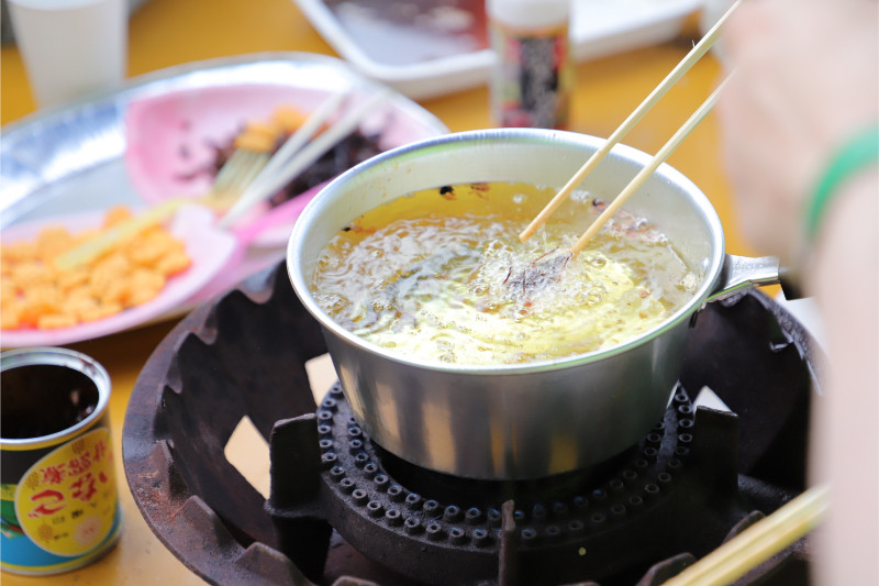 油引いてる・・・揚げ物でもやるのだろうか・・・、とタッパーのようなものの中を撮っている人たち。