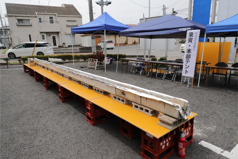 前回は地べたにU字溝を置いていたので、焼き場が低い位置で若干不便でしたが、今回はビールケースの上にコンパネを置いてテーブルのような感じで使えるようになり、高さを出しているので、しゃがまずに焼けるようになりました。