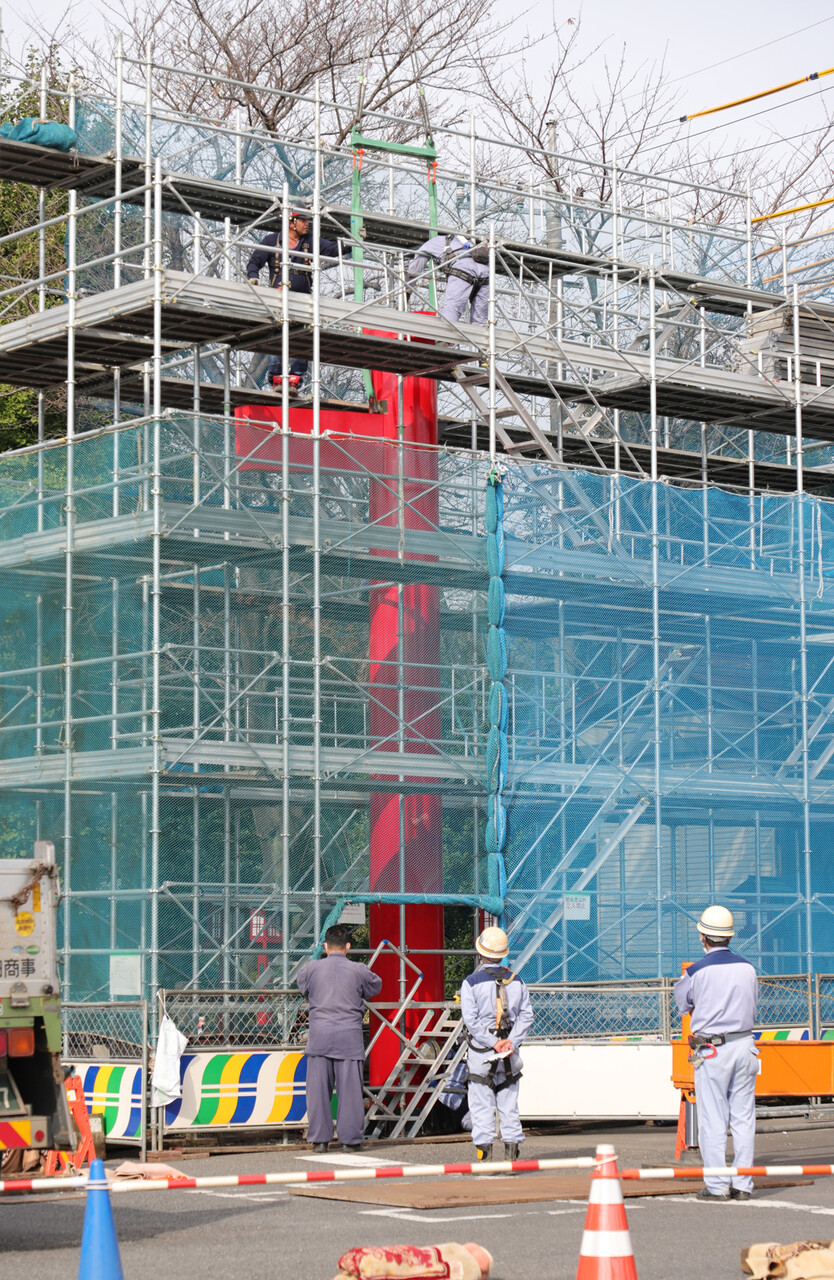 柱の根元どうなてるのか見たいけど一般人は遠くから見守るのみ。