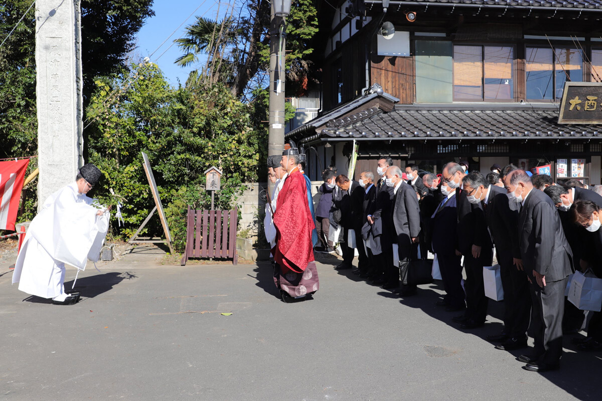 そうこうしていると、拝殿で式典?が終わり、氏子さんや関係者が鳥居前に集合。