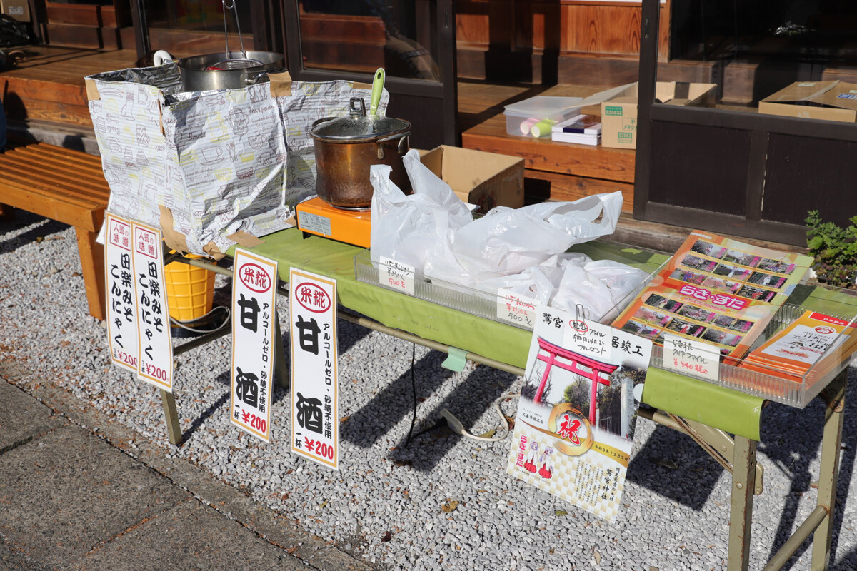 軒先では定番の、甘酒や田楽味噌こんにゃくが売られてました。