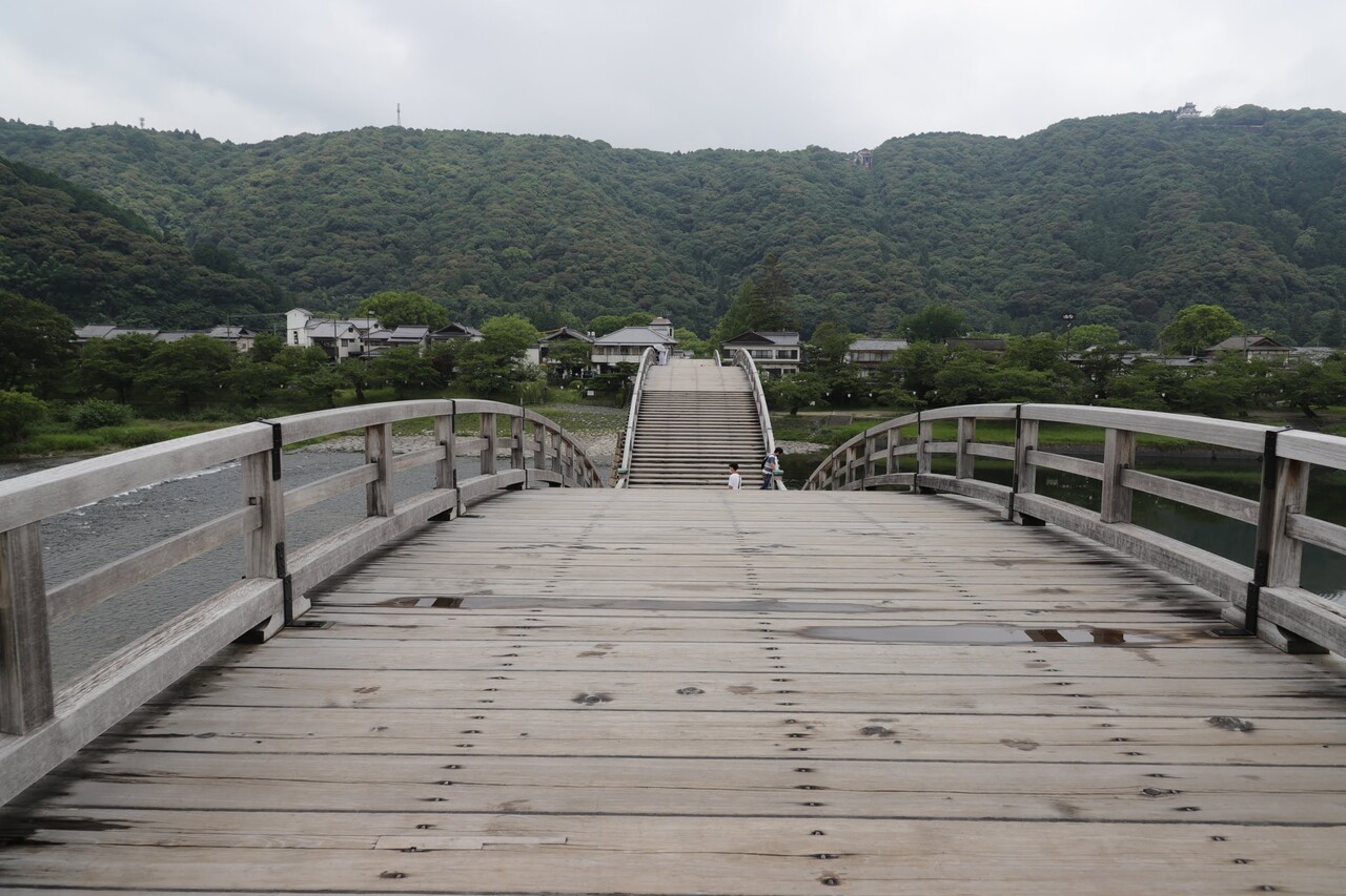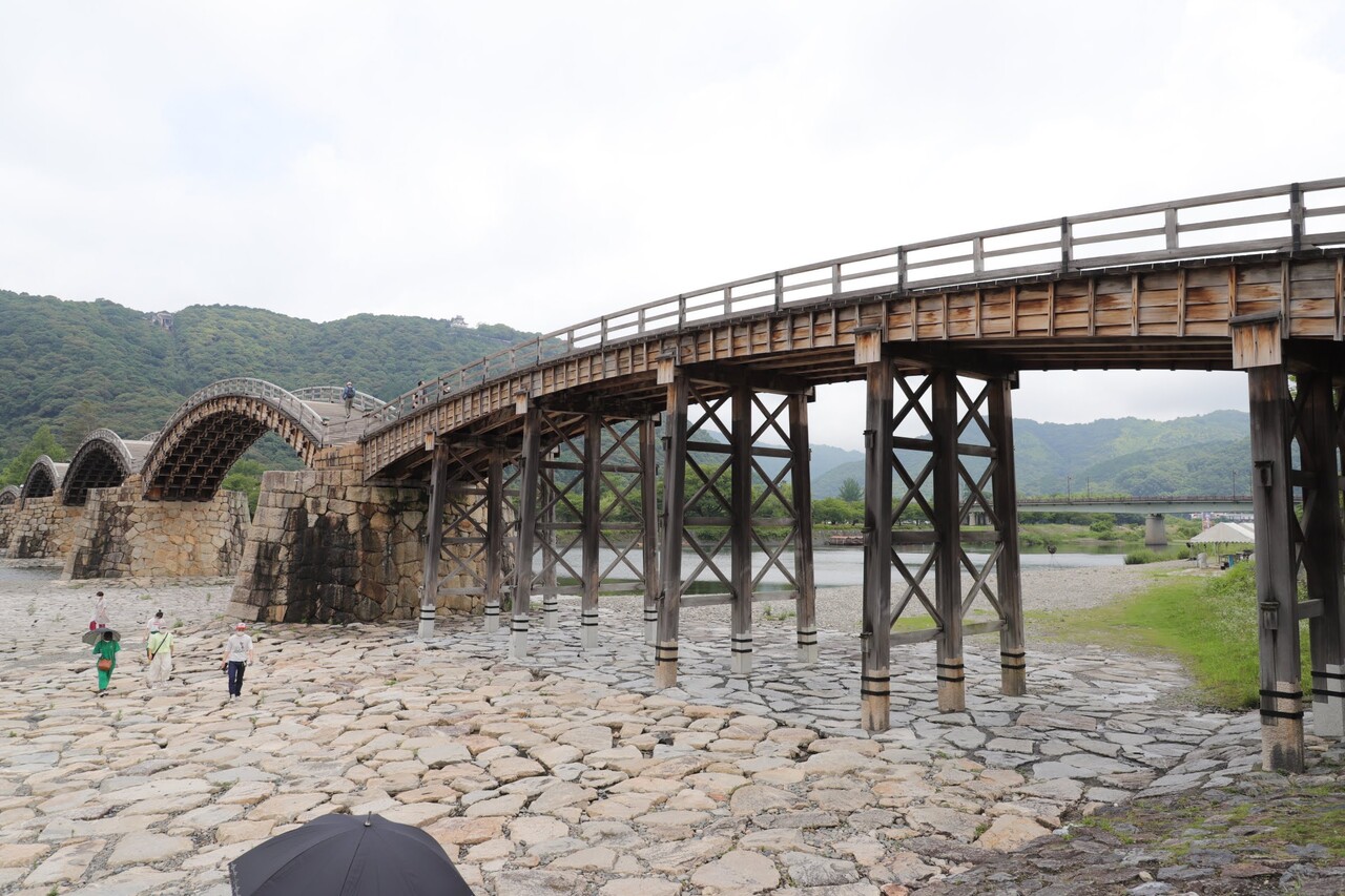 見事な5連の木造アーチ橋。日本三名橋に数えられているだけはある。