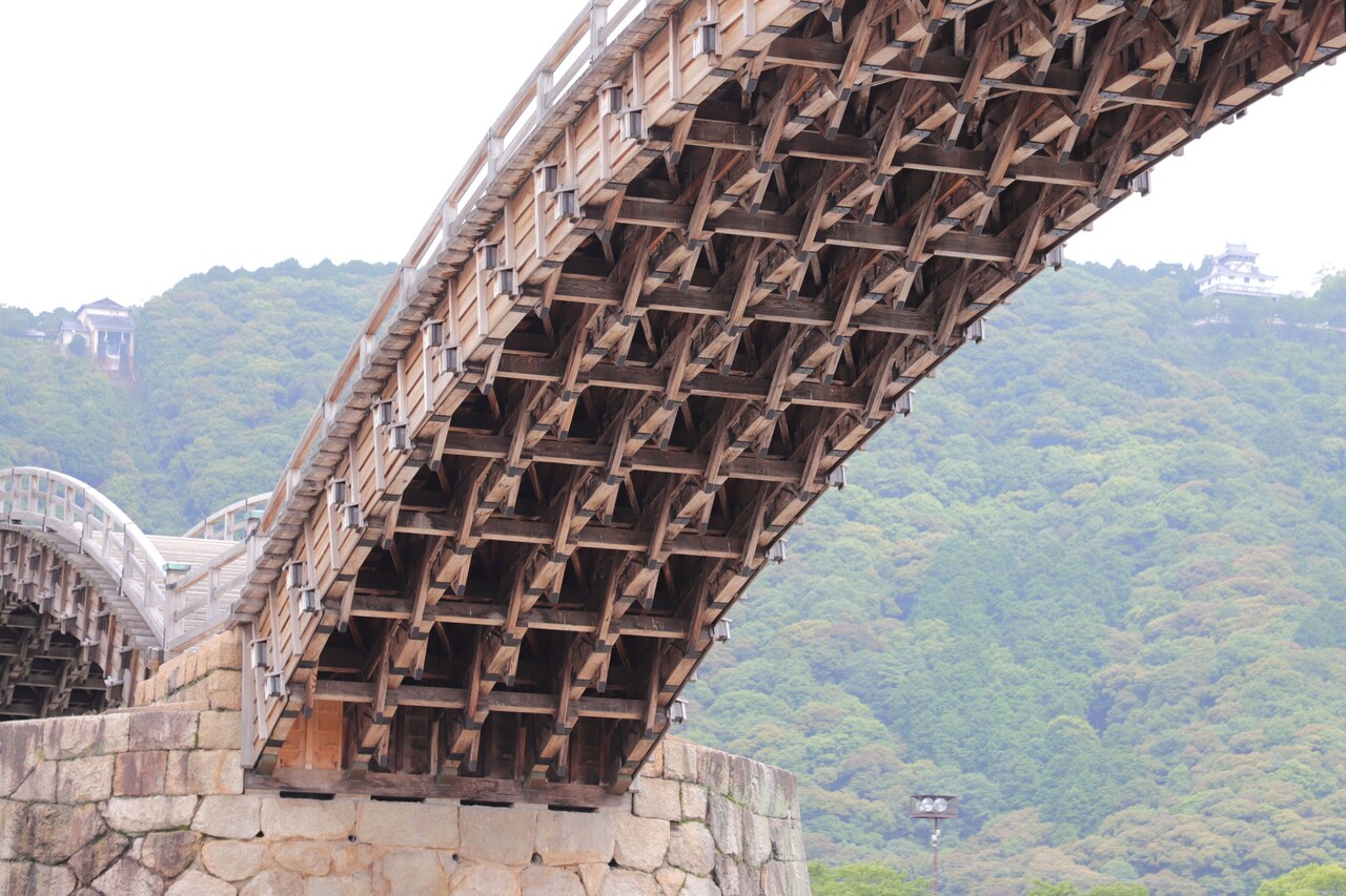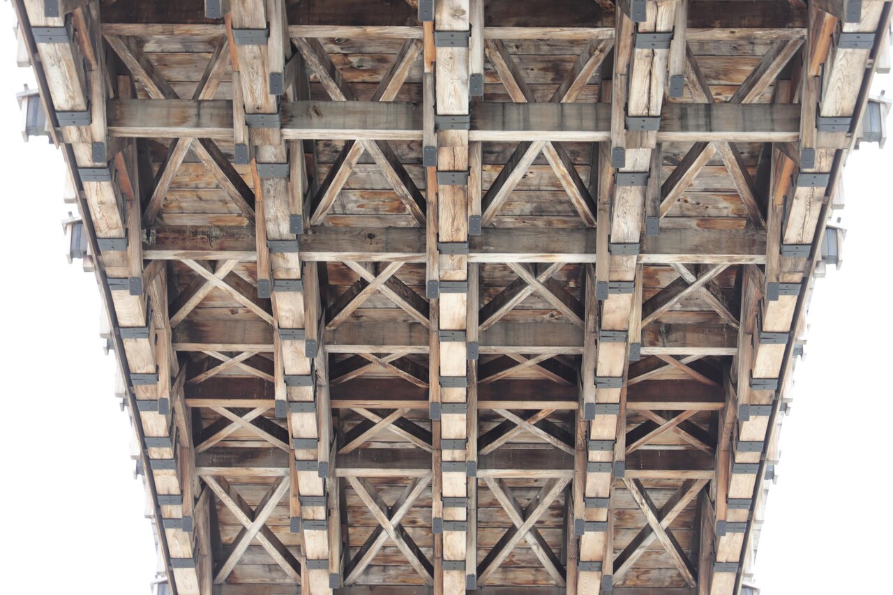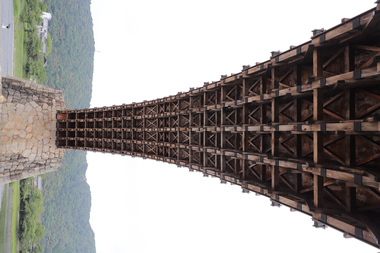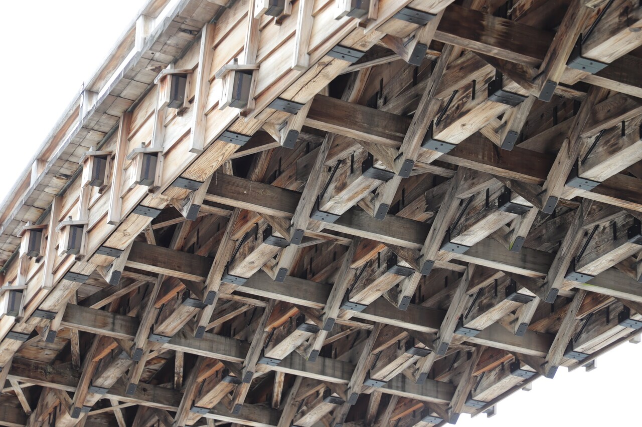 橋の上からだと見えない下からの木組みの構造は、模様にも見えるほどとても綺麗で整然としてて芸術的でした。