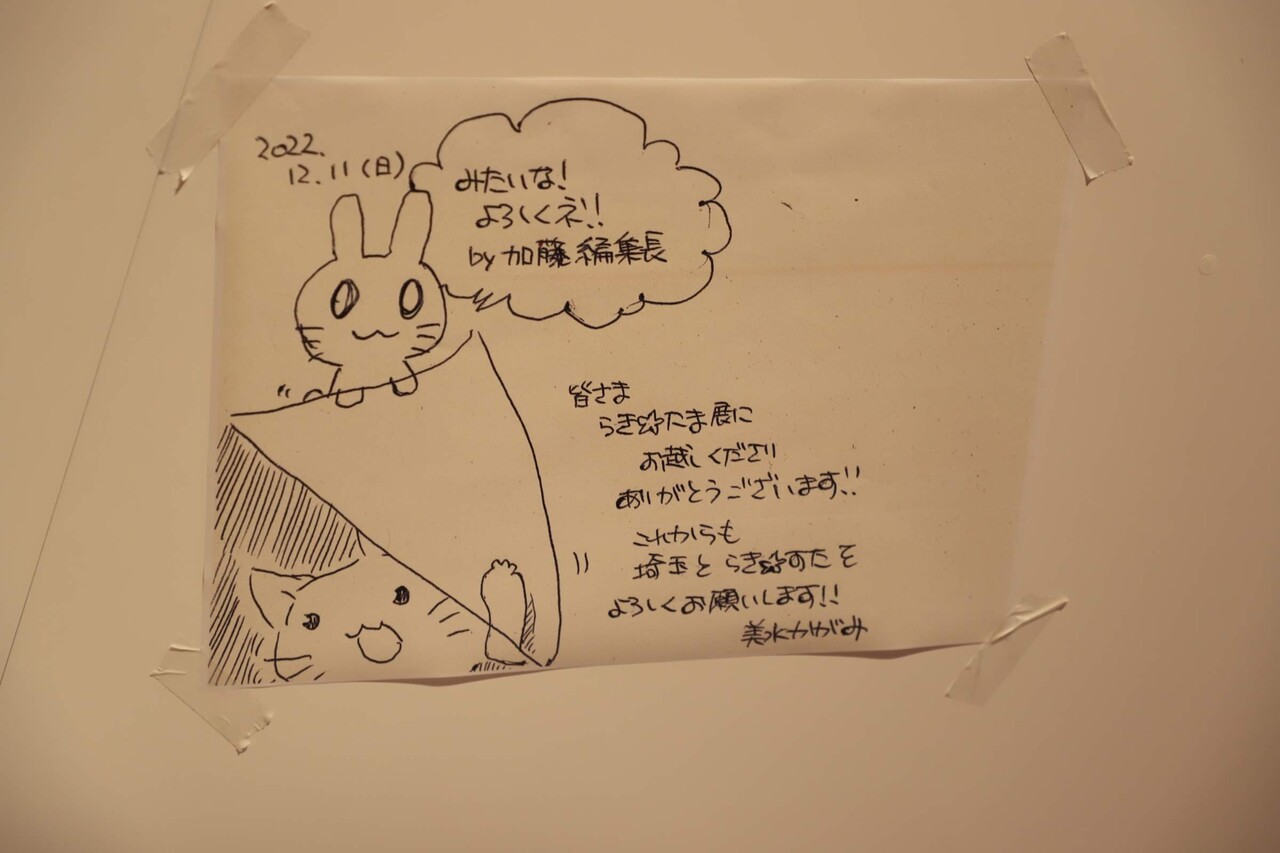 メッセージノートのコーナーには、美水先生と加藤編集長のイラストが張られてました。