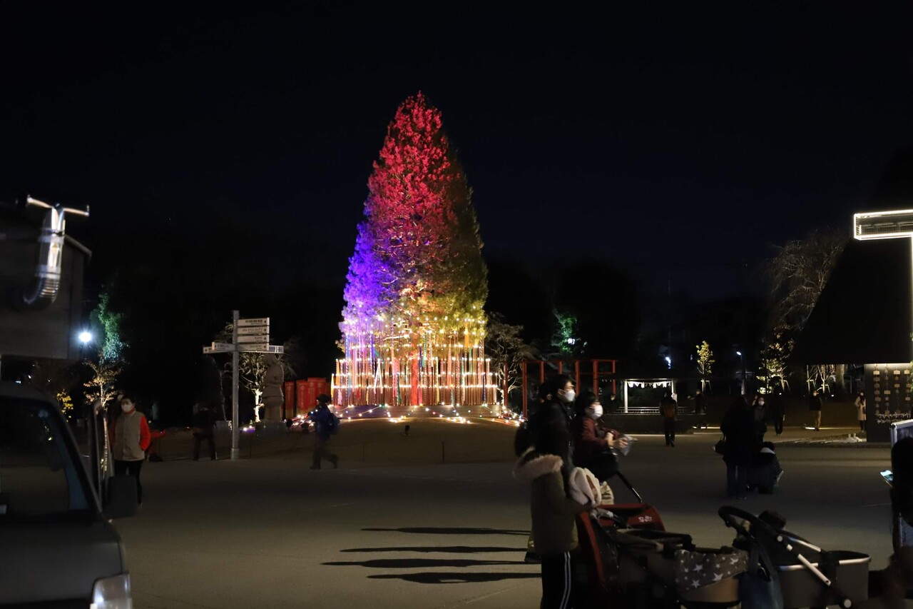 外に出ると外は暗くなって、令和神社周辺がライトアップされてました。