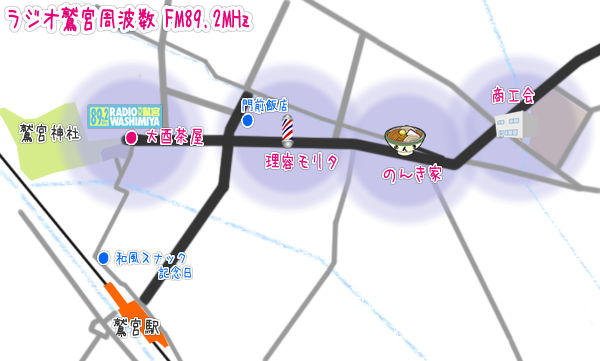 とはいえ、今回の第6回からは鷲宮商店街の協力で電波発信用アンテナを数箇所に設置したことで放送範囲が鷲宮神社鳥居前の他に、商店街から鷲宮商工会周辺100mほどまで拡大する予定です。